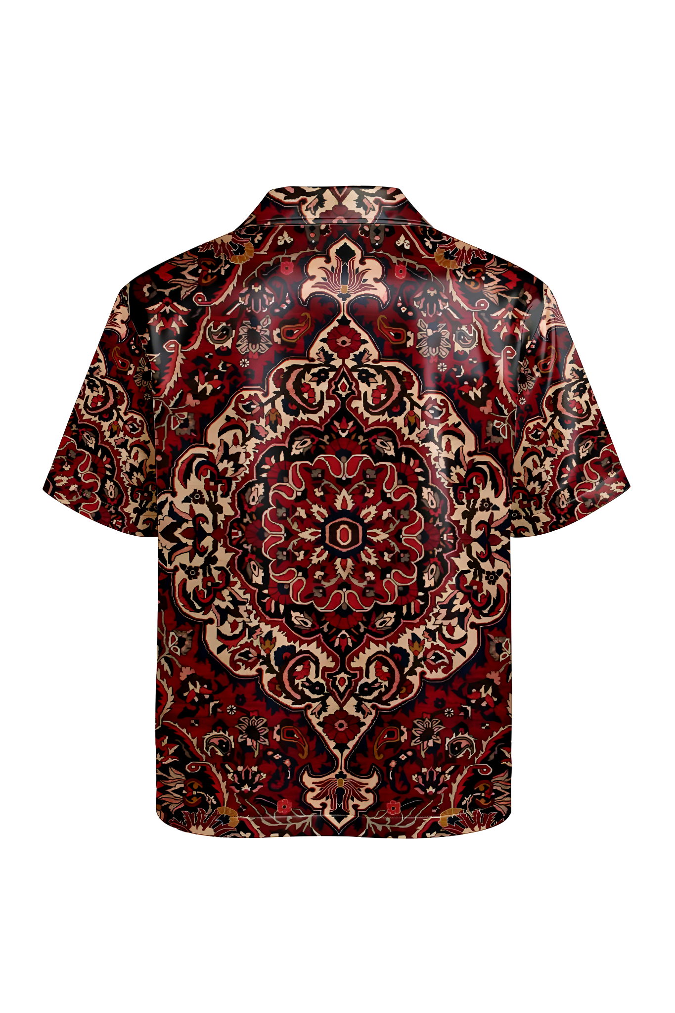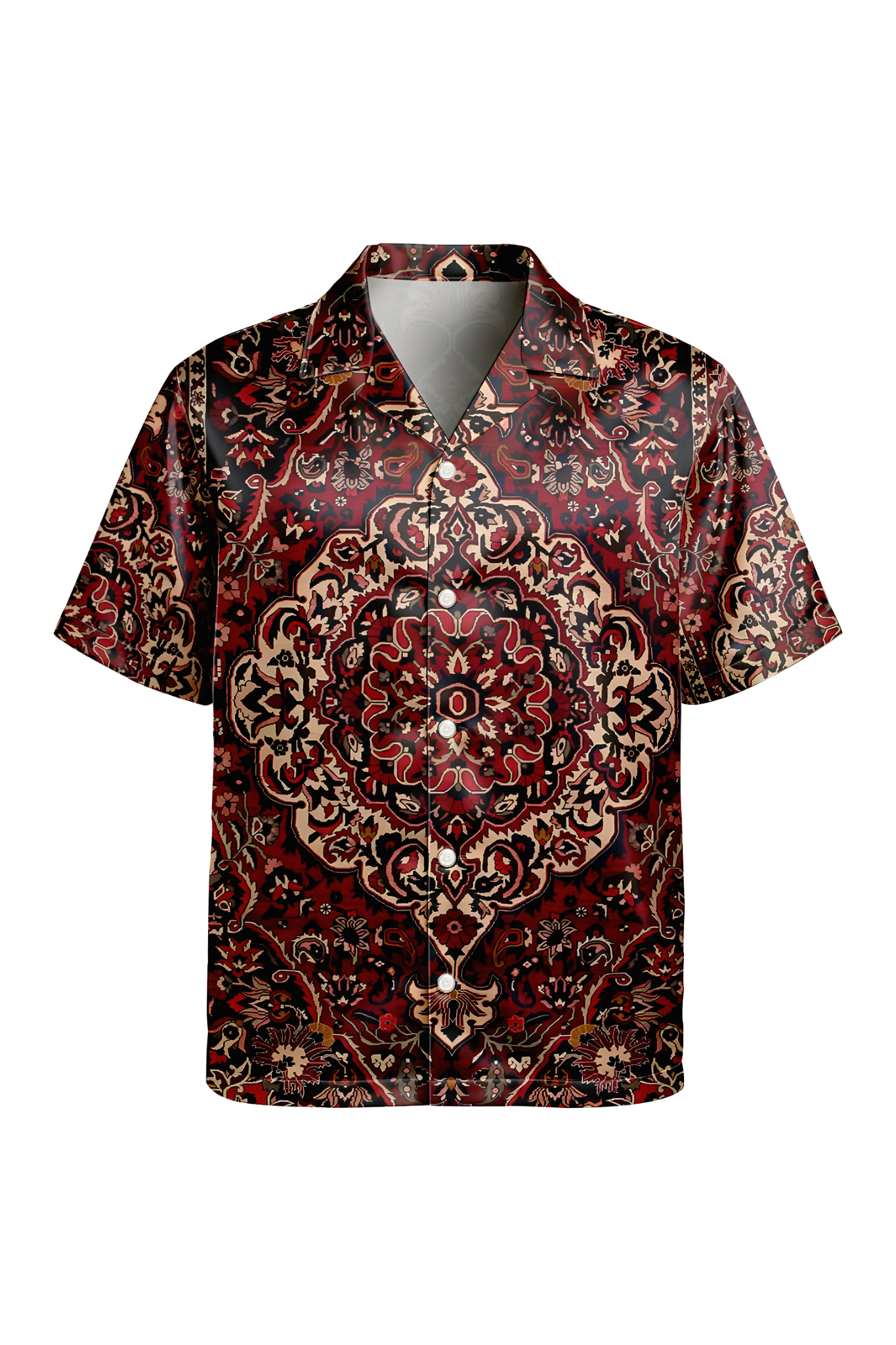 Heritage meets bold modernity in the Embers & Silk shirt, a striking reimagining of traditional Persian rug artistry. With its detailed medallion centerpiece and winding floral vines, the design balances richness and refinement, while the fiery crimson tones bring a sense of passion to the calm ivory base. Executed on glossy Japan satin, this shirt radiates warmth, strength, and timeless elegance for the culturally attuned and sartorially daring.