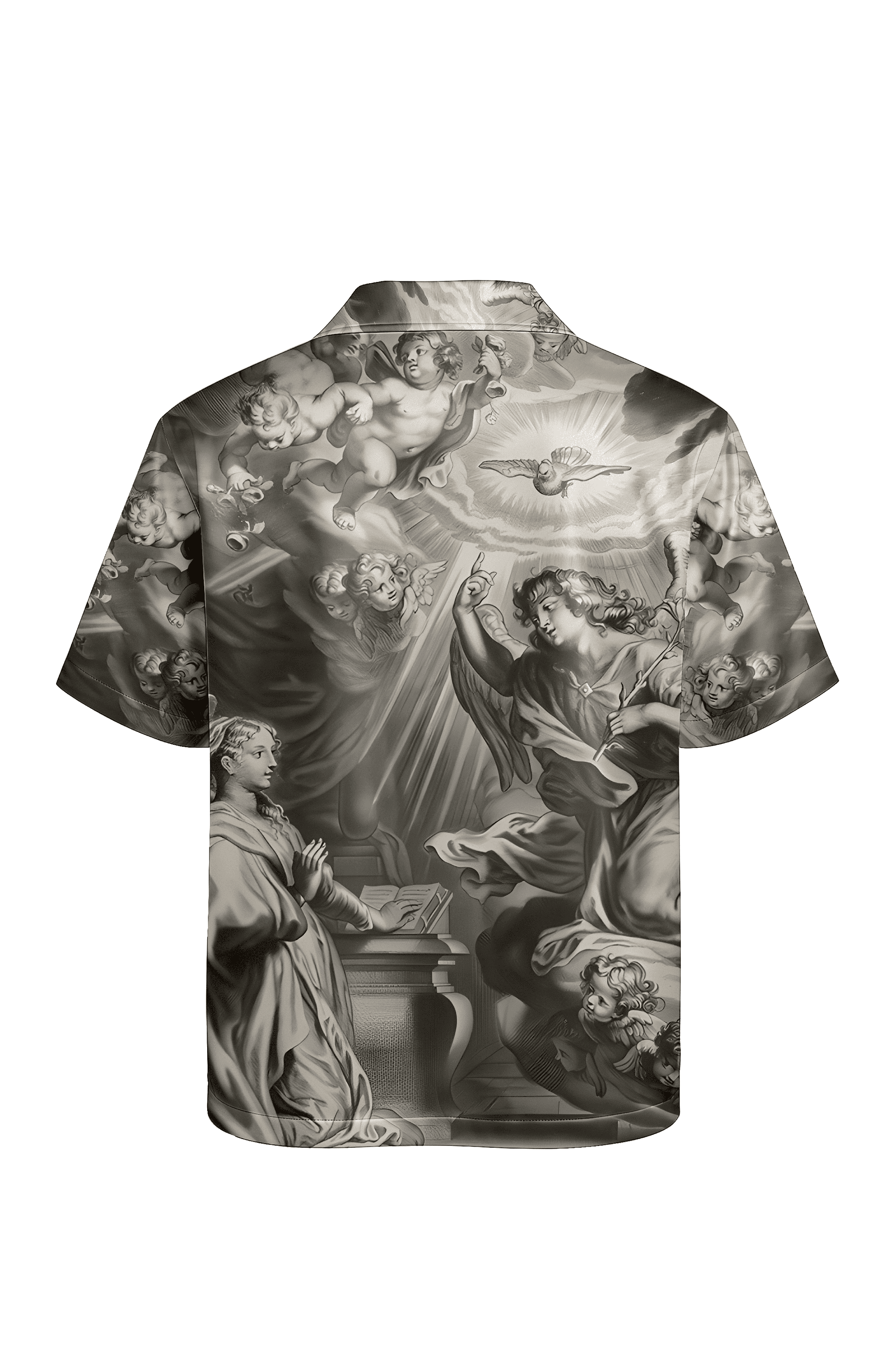 Soft in tone, bold in story. The Beige Renaissance shirt blends muted elegance with high drama — a canvas of celestial calm interrupted by hints of divine conflict. Set against a beige Japanese satin base, this oversized box fit shirt features subtle Renaissance-era artwork that speaks of angels, demons, and the fragile line in between. Understated yet powerful, this piece is made for those who prefer their rebellion wrapped in grace.