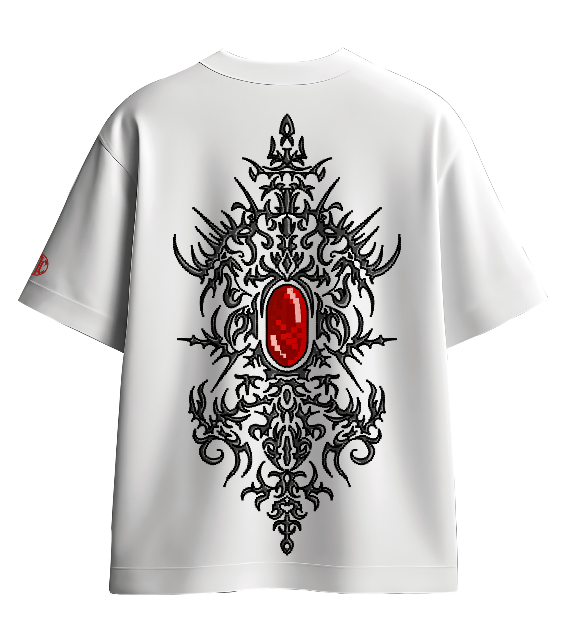 Make a bold statement with our white tee, featuring a striking pixelated cybersigil print centered around a captivating gemstone. Crafted from premium cotton, this shirt offers both comfort and edge. Whether you're dressing up or down, this unique piece adds a touch of digital luxury to your wardrobe.