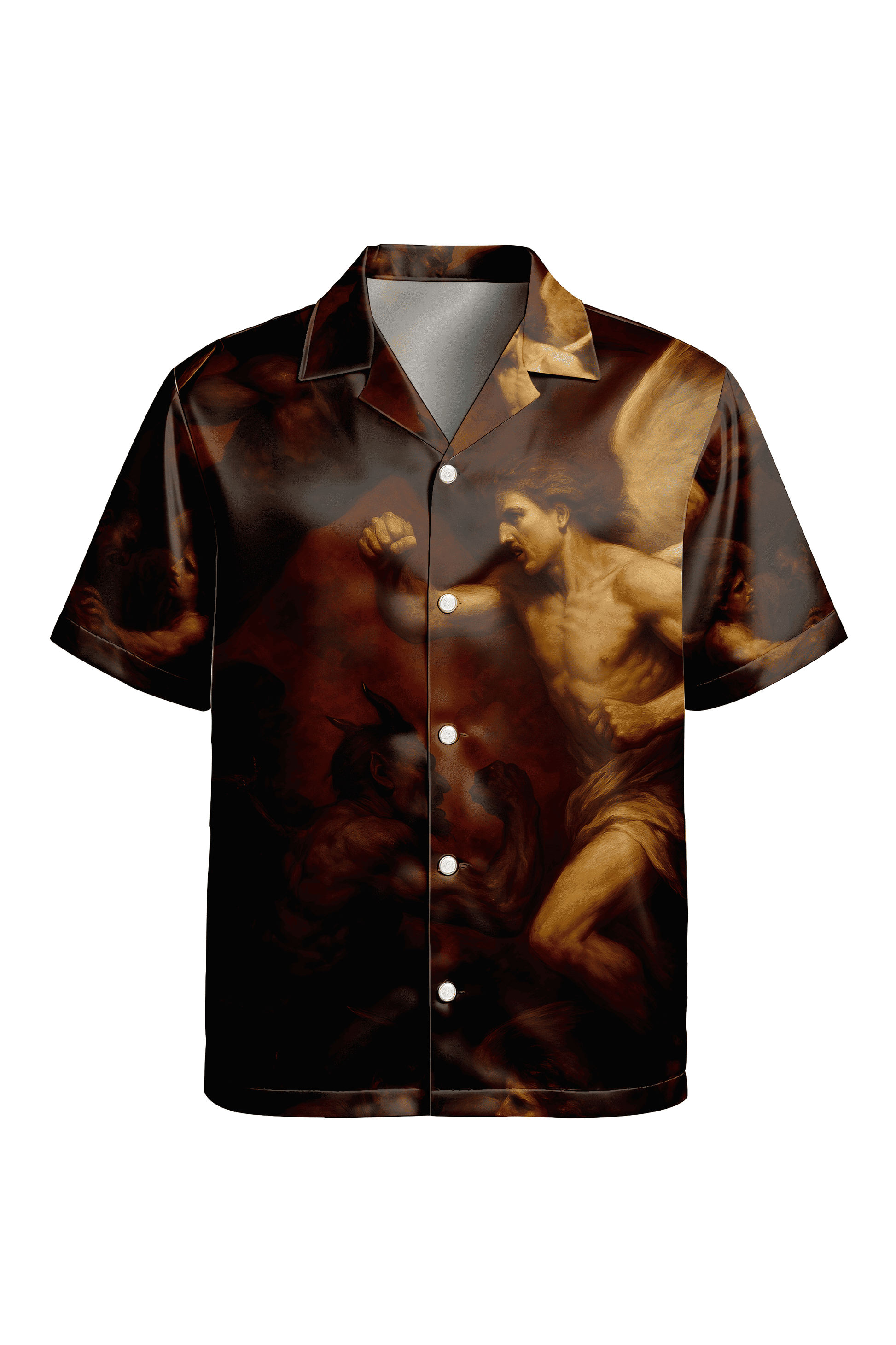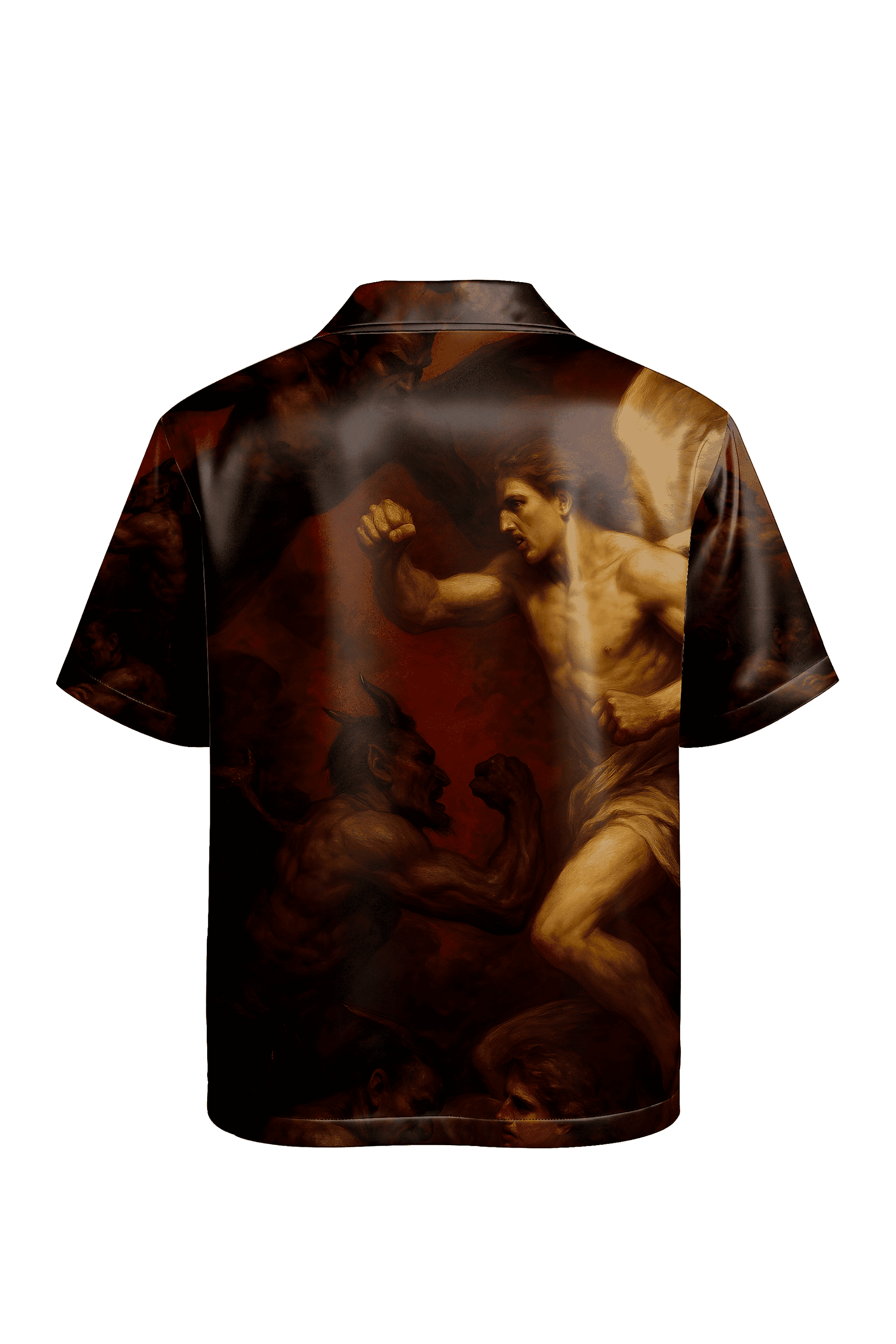 This oversized box fit shirt tells the story of a cosmic clash — Heaven’s War, fought on your back. Featuring a powerful Renaissance-inspired illustration of angels and demons locked in eternal battle, the design captures divine beauty and brutal chaos in one frame. Crafted in smooth Japanese satin for fluid drape and subtle sheen, this half-sleeve piece is made for those who wear myth, art, and rebellion all at once.