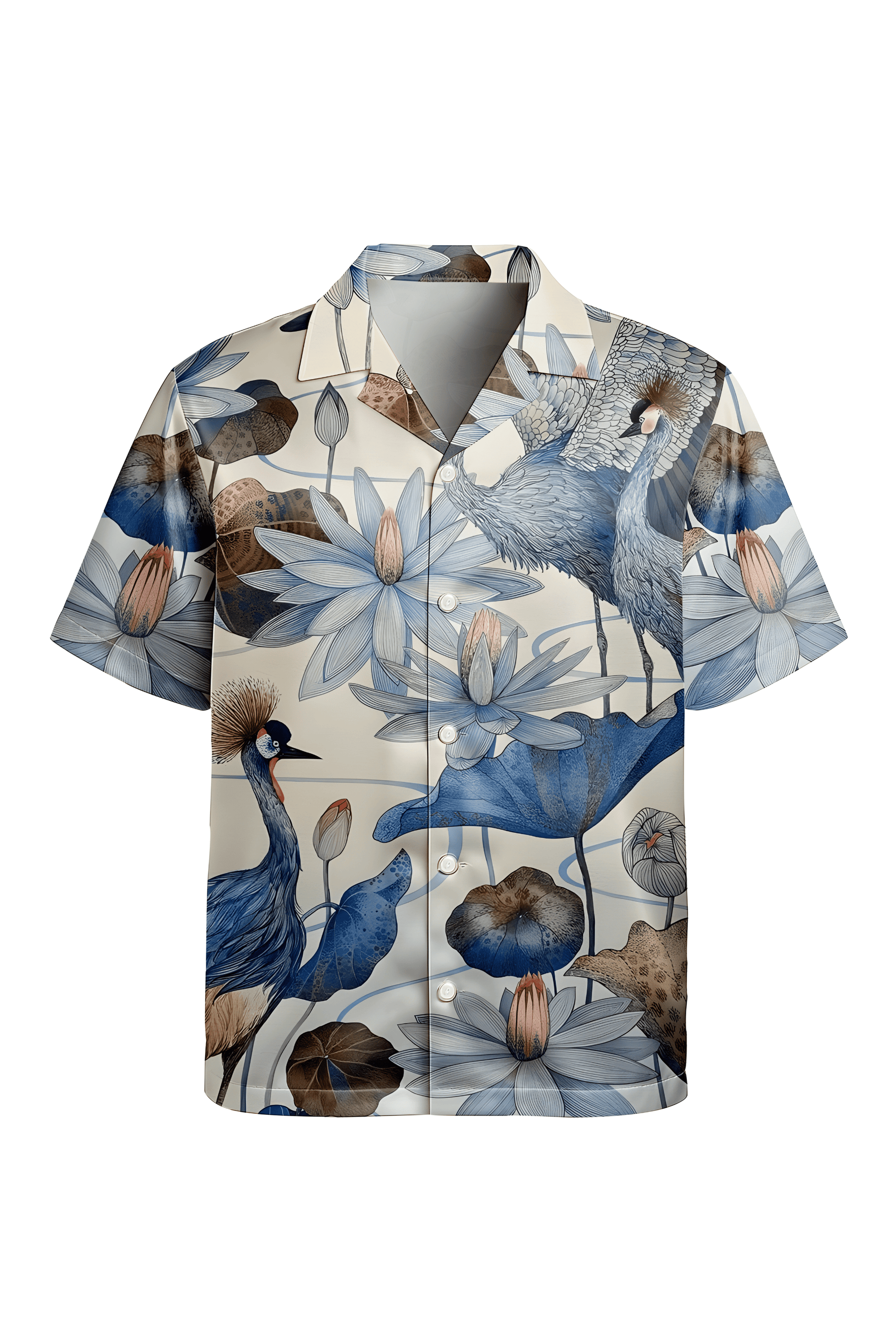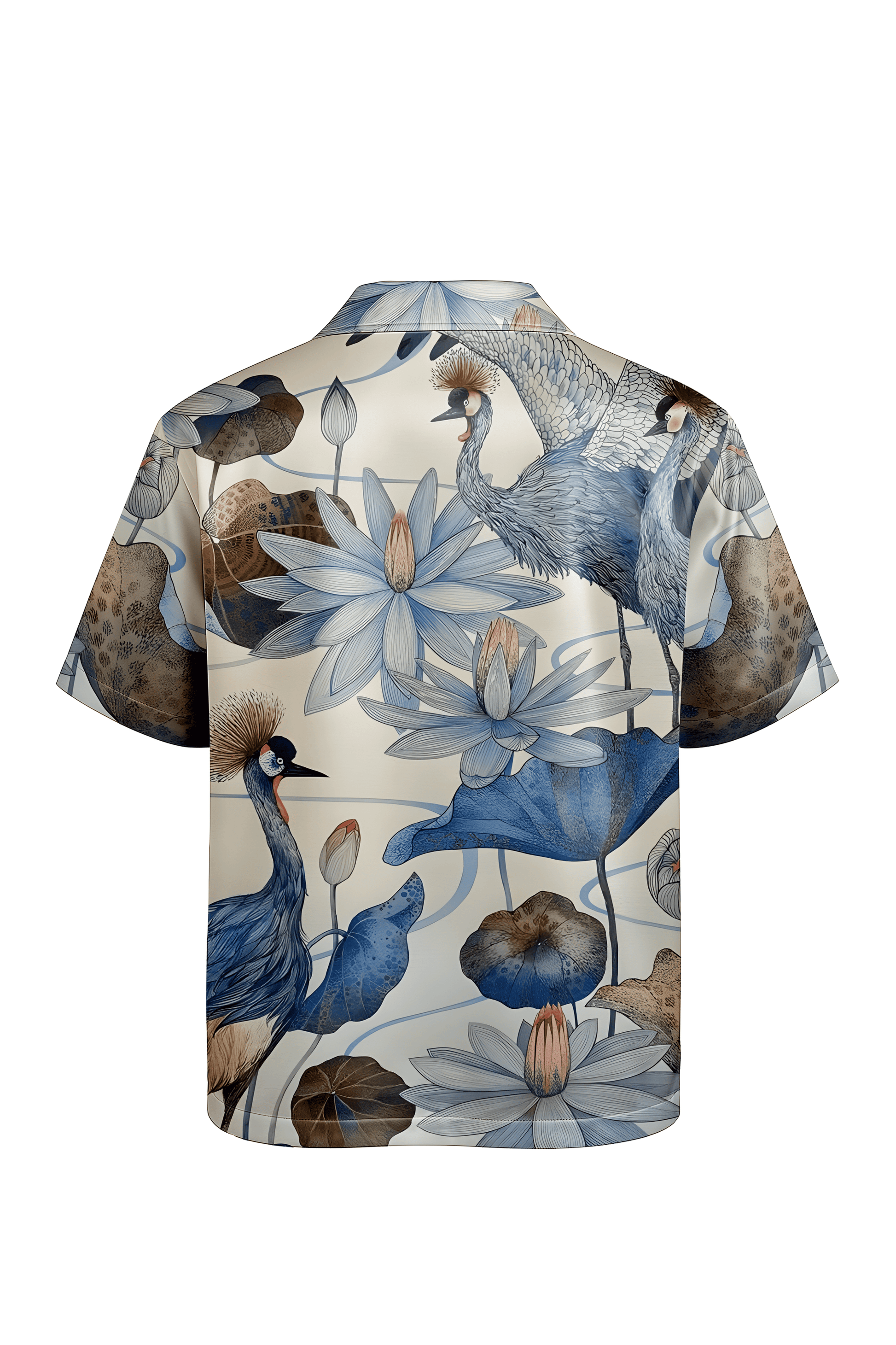 Float between worlds of still water and soft flight. The Lotus Mirage shirt showcases an intricate all-over print of crowned cranes amid blooming lotus flowers — a dreamlike tableau drawn in serene blues, sepia browns, and ivory tones. Its fluid composition evokes the peaceful rhythm of wetland life, rendered on luxurious satin for a wearable piece of nature-inspired art.