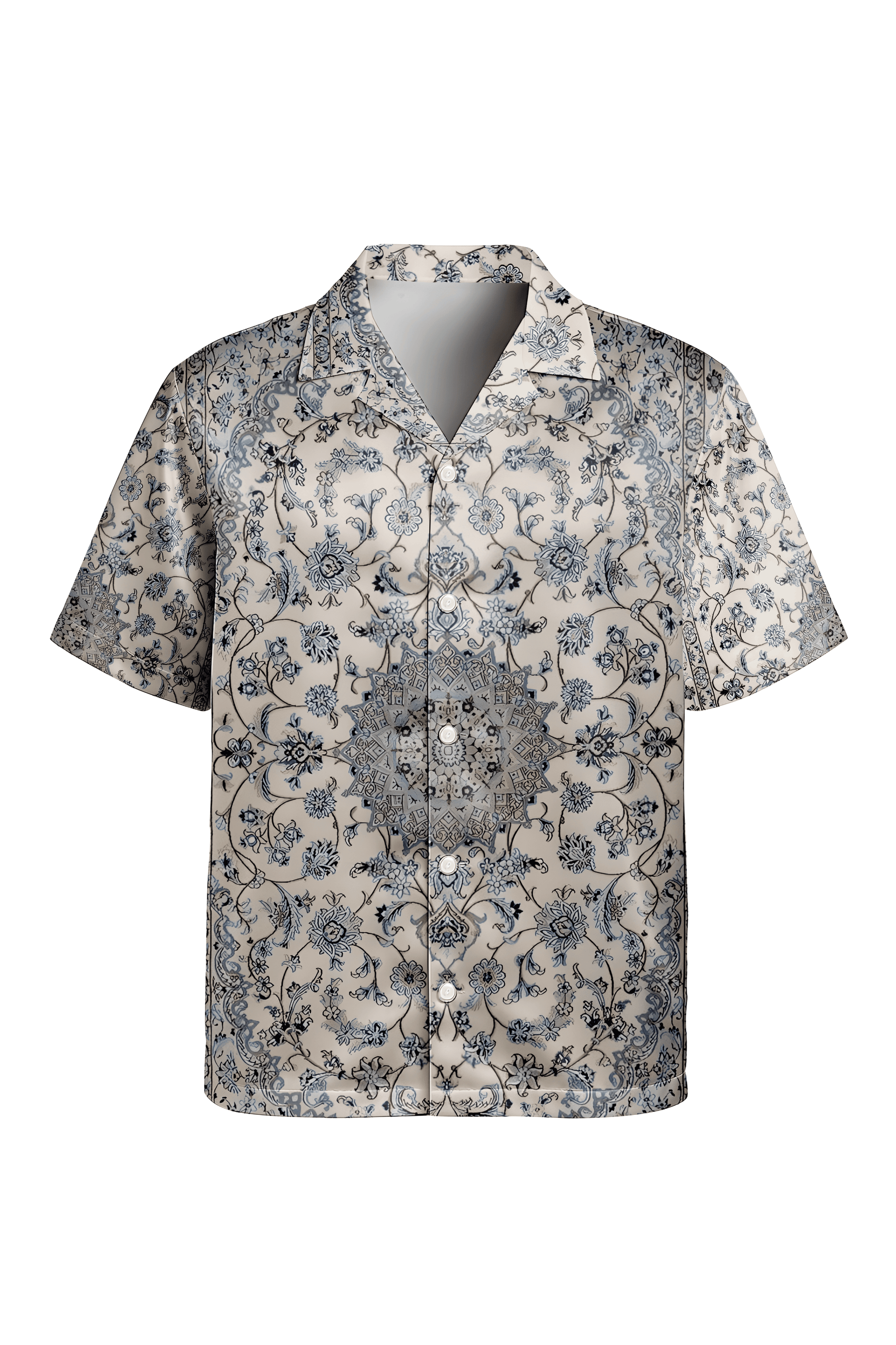Heritage meets modern elegance in the Sands & Silk shirt, an intricately designed piece inspired by traditional Persian rug artistry. With a detailed medallion centrepiece and fine floral vines woven across the canvas, this design exudes luxury and calm in equal measure. Executed in soft blues and antique ivory on a glossy satin finish, it's a piece made for the culturally attuned and sartorially bold.